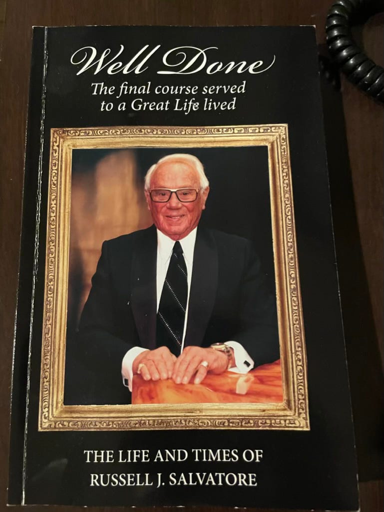 Our room was fine, clean, and in keeping with the 1980s in Staten Island theme. But I’m sorry to report that it was not one of the rooms with a hot tub in the floor. So, tripping and nearly drowning while getting out of bed in the middle of the night is something I’ve yet to experience. In place of the Gideons’ bible, one finds Well Done. The final course served to a Great Life lived. The Life and Times of Russell J. Salvatore. Of course the title is a steak pun. I read an uncomfortable amount of that book. “When [Russell] was in school, all the girls wore jewelry. These days the boys do.”