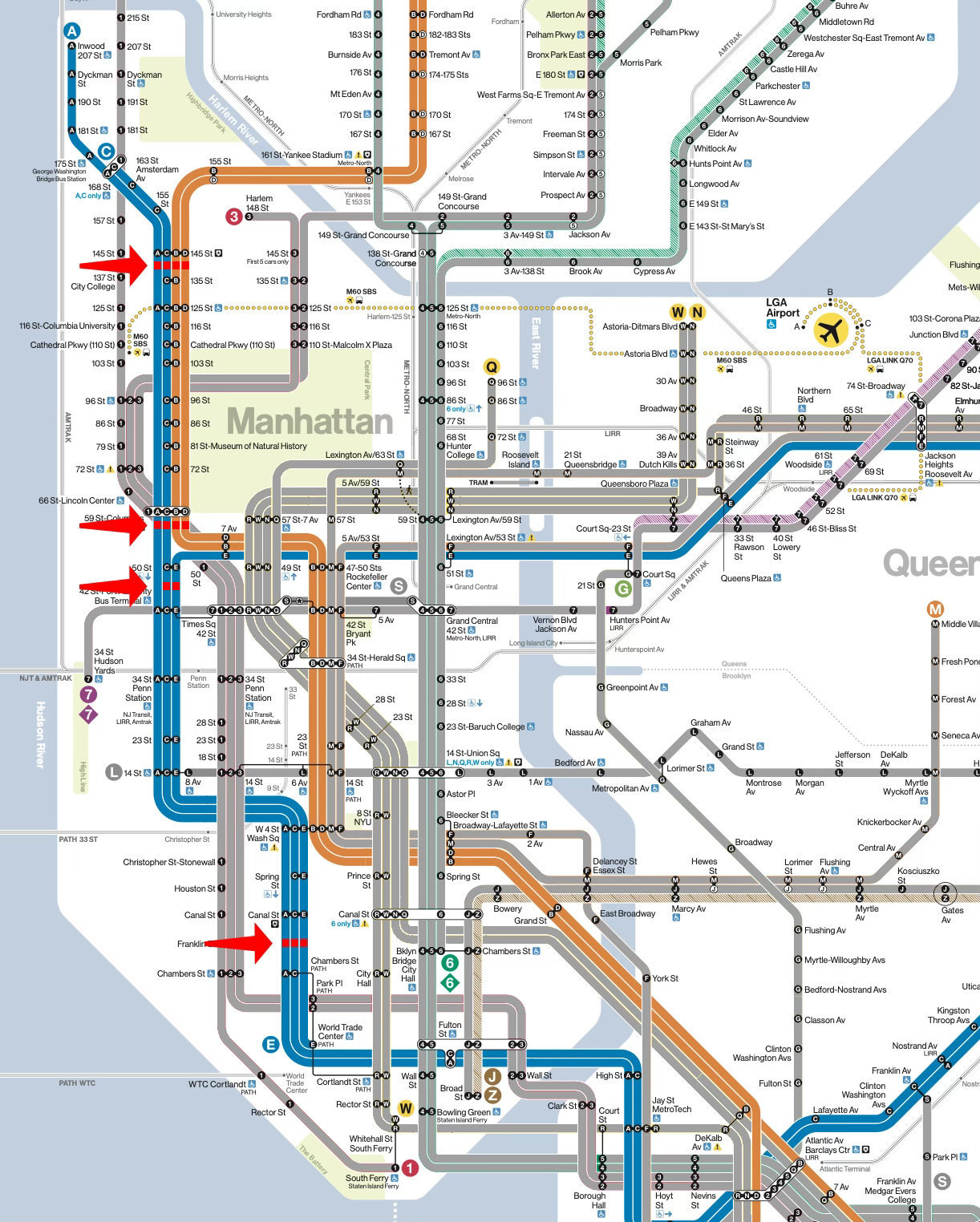 e.g., getting from 23rd Street to 72nd Street would require a local E to express A/C to local B/D trip.